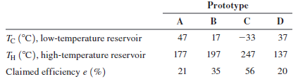 Prototype A в с B D Tc (°C), low-temperature reservoir 47 17 -33 37 TH (°C), high-temperature reservoir 177 197 247 137 Claimed efficiency e (%) 21 35 56 20