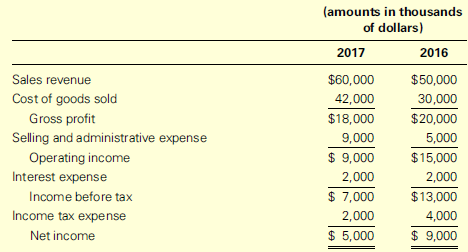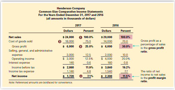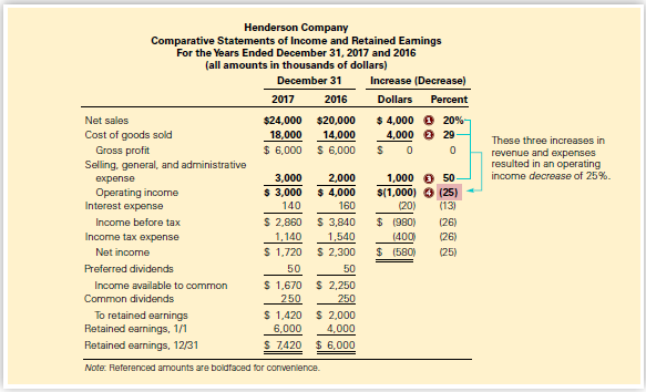 (amounts in thousands of dollars) 2017 2016 Sales revenue $60,000 $50,000 Cost of goods sold 42,000 30,000 Gross profit Selling and administrative expense $18,000 $20,000 9,000 5,000 Operating income $ 9,000 $15,000 Interest expense 2,000 2,000 Income before tax $ 7,000 $13,000 Income tax expense 2,000 4,000 Net income $ 5,000 $ 9,000 Henderson Company Common-Size Comparative Income Statements For the Years Ended December 31, 2017 and 2016 (all amounts in thousands of dollars) 2017 2016 Dollars Percent Dollars Percent $ 24,000 в 18,000 $ 6,000 $ 20,000 14,000 $ 6,000 Net sales e 100.0% 100.0% Gross profit as a percentage of sales is the gross profit ratio. Cost of goods sold 75.0 70.0 Gross profit e 25.0% 30.0% Selling, general, and administrative 2,000 $ 4,000 160 expense 3,000 12.5 10.0 Operating income $ 3,000 12.5% 20.0% Interest expense 140 0.6 0.8 $ 2,860 1,140 $ 3,840 Income before tax 11.9% 19.2% Income tax expense 4.8 1,540 77 The ratio of net income to net sales is the profit margin ratio. Net income 1,720 7.1% $ 2,300 11.5% Note: Referenced amounts are boldfaced for convenience. Henderson Company Comparative Statements of Income and Retained Eamings For the Years Ended December 31, 2017 and 2016 (all amounts in thousands of dollars) December 31 Increase (Decrease) 2017 2016 Dollars Percent $ 4,000 0 20%- 4,000 0 29 Net sales $24,000 $20,000 Cost of goods sold Gross profit Selling, general, and administrative 18,000 $ 6,000 14,000 $ 6,000 These three increases in revenue and expenses resulted in an operating 3,000 2,000 income decrease of 25%. 1,000 e 50- S(1,000) O (25) (20) expense $ 3,000 $ 4,000 Operating income Interest expense 140 160 (13) Income before tax $ 2,860 $ 3,840 $ (980) (26) Income tax expense 1,140 1,540 (400 (26) Net income $ 1,720 $ 2,300 $ (580) (25) Preferred dividends 50 50 $ 1,670 250 $ 2,250 250 Income available to common Common dividends $ 1,420 To retained earnings Retained earnings, 1/1 $ 2,000 4,000 $ 6,000 6,000 Retained earnings, 12/31 S 7420 Note: Referenced amounts are boldfaced for convenlence.