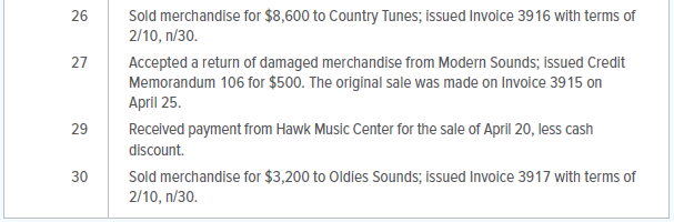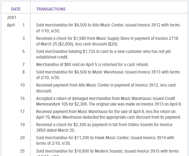 Incredible Sounds is a wholesale business that sells musical instruments. Transactions involving sales and cash receipts for the firm during April 20X1 follow. The firm sells its merchandise for cash and on open account. During April, Incredible Sounds engaged in the following transactions: