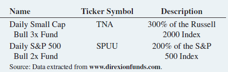Name Ticker Symbol Description Daily Small Cap TNA 300% of the Russell Bull 3x Fund 2000 Index Daily S&P 500 SPUU 200% of the S&P Bull 2x Fund 500 Index Source: Data extracted from www.direxionfunds.com.