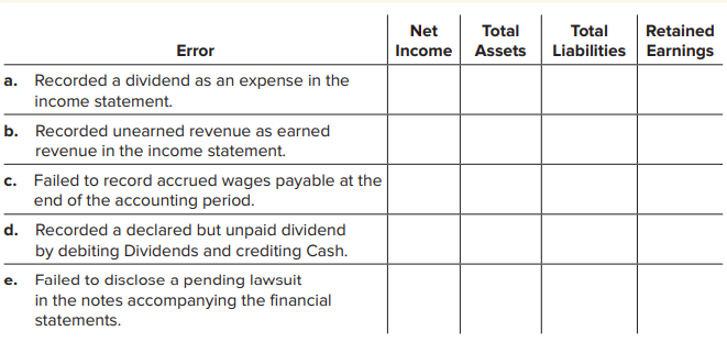Indicate the effect of the following errors on each of the financial statement elements described in the column headings in the following table. Use the following symbols: O = overstated, U = understated, and NE = no effect.