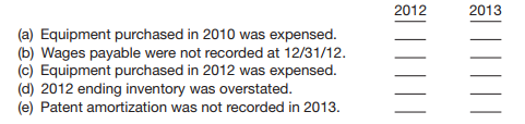 2012 2013 (a) Equipment purchased in 2010 was expensed. (b) Wages payable were not recorded at 12/31/12. (c) Equipment purchased in 2012 was expensed. (d) 2012 ending inventory was overstated. (e) Patent amortization was not recorded in 2013.