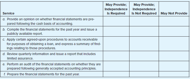 May Provide; Independence Independence Is Required May Provide; Service Is Not Required May Not Provide a. Provide an opinlon on whether financlal statements are pre- pared following the cash basls of accounting. b. Complle the financlal statements for the past year and Issue a publicly avallable report. c. Apply certaln agreed-upon procedures to accounts recelvable for purposes of obtalning a loan, and express a summary of find- Ings relating to those procedures. d. Revlew quarterly Information and Issue a report that Includes limited assurance. e. Perform an audit of the financlal statements on whether they are prepared following generally accepted accounting principles. f. Prepare the financlal statements for the past year.