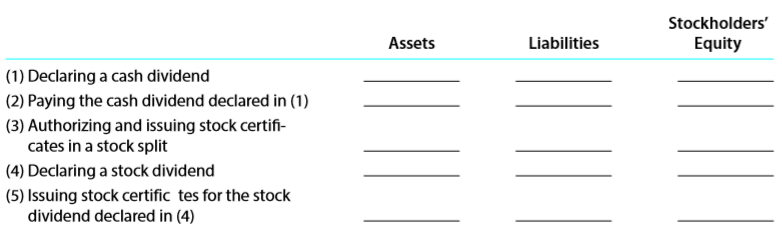 Stockholders' Assets Liabilities Equity (1) Declaring a cash dividend (2) Paying the cash dividend declared in (1) (3) Authorizing and issuing stock certifi- cates in a stock split (4) Declaring a stock dividend (5) Issuing stock certific tes for the stock dividend declared in (4)