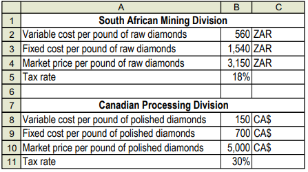 A 1 South African Mining Division 560 ZAR 2 Variable cost per pound of raw diamonds 3 Fixed cost per pound of raw diamonds 4 Market price per pound of raw diamonds 5 Tax rate 1,540 ZAR 3,150 ZAR 18% 7 Canadian Processing Division 8 Variable cost per pound of polished diamonds 9 Fixed cost per pound of polished diamonds 10 Market price per pound of polished diamonds 11 Tax rate 150 CAS 700 CA$ 5,000 CAS 30%