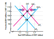 > Initially, the short-run aggregate supply curve is SAS0 and the aggregate demand curve is AD0. Some events change aggregate demand from AD0 to AD1. Describe two events that could have created this change in aggregate demand. What is the equilibrium afte