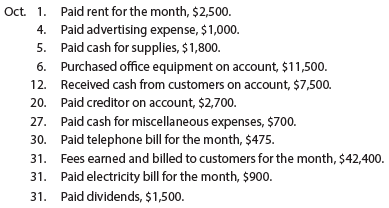 Oct. 1. Paid rent for the month, $2,500. 4. Paid advertising expense, $1,000. 5. Paid cash for supplies, $1,800. 6. Purchased office equipment on account, $11,500. 12. Received cash from customers on account, $7,500. 20. Paid creditor on account, $2,700. 27. Paid cash for miscellaneous expenses, $700. 30. Paid telephone bill for the month, $475. 31. Fees earned and billed to customers for the month, $42,400. 31. Paid electricity bill for the month, $900. 31. Paid dividends, $1,500.