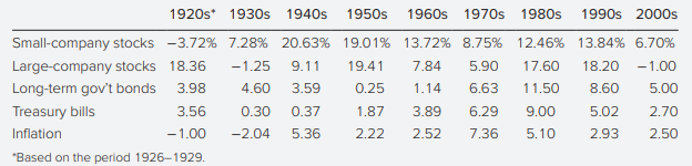 > Convert the asset returns by decade presented in the table into real rates. Repeat Problem 20 for the real rates of return.