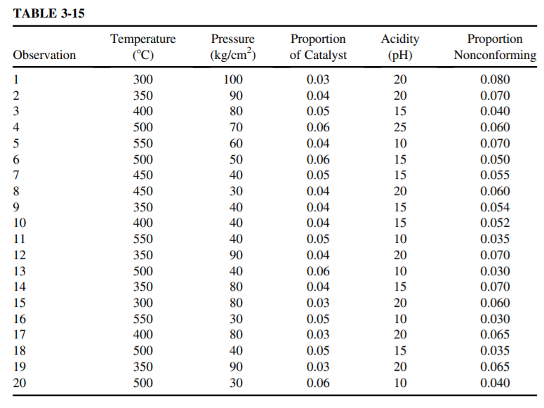 > In a chemical process, the parameters of temperature, pressure, proportion of catalyst, and pH value of the mixture influence the acceptability of the batch. The data from 20 observations are shown in Table 3-15. (a) Construct a multivariable chart. What