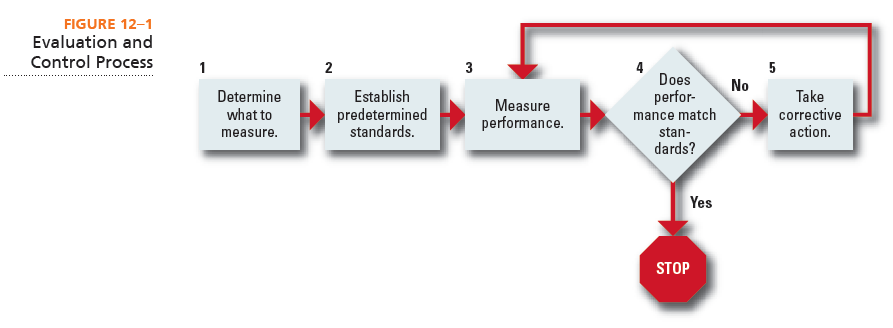 FIGURE 12–1 Evaluation and 三 Control Process 2 3 4 Does perfor- 5 No Determine what to Establish Take corrective action. Measure predetermined standards. mance match performance. measure. stan- dards? Yes STOP