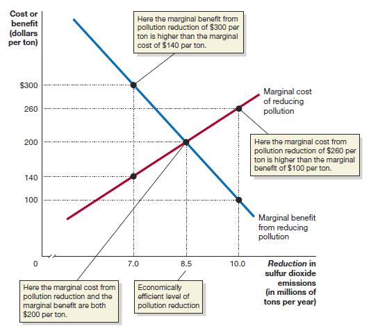 Cost or Here the marginal benefit from pollution reduction of $300 per ton is higher than the marginal cost of $140 per ton. benefit (dollars per ton) $300 Marginal cost of reducing pollution 260 Here the marginal cost from pollution reduction of $260 per ton is higher than the marginal benefit of $100 per ton. 200 140 100 Marginal benefit from reducing pollution 7.0 8.5 10.0 Reduction in sulfur dioxide Here the marginal cost from pollution reduction and the marginal benefit are both $200 per ton. emissions (in millions of tons per year) Economically efficient level of pollution reduction