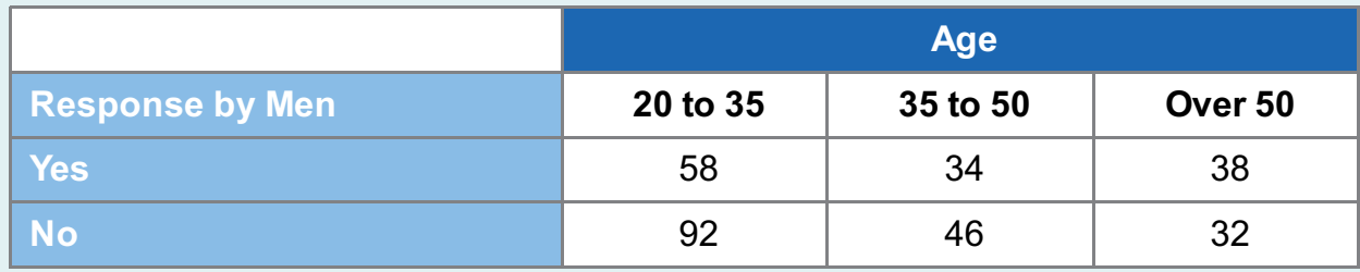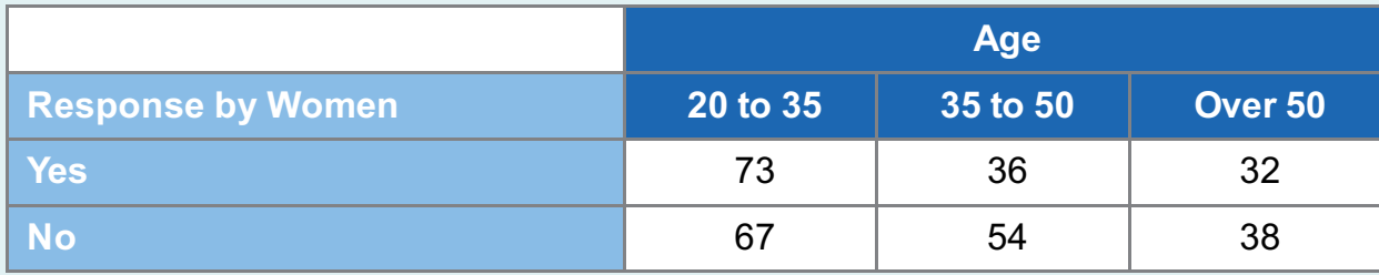 Age Response by Women 20 to 35 35 to 50 Over 50 Yes 73 36 32 No 67 54 38 Age Response by Men 20 to 35 35 to 50 Over 50 Yes 58 34 38 No 92 46 32