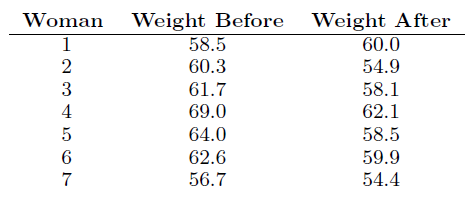 Woman Weight Before Weight After 58.5 1 60.0 60.3 54.9 3 61.7 58.1 4 69.0 62.1 64.0 58.5 62.6 59.9 7 56.7 54.4