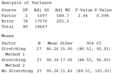 Analysis of Variance DF Adj ss Adj MS F-Value P-Value Source Factor 2 1097 548.7 2.44 0.094 Error 78 17570 225.3 Total 80 18667 Means Factor N Mean StDev 95% CI Stretching 27 86.26 15.95 (80.51, 92.01) Method 1 Stretching 27 90.30 17.06 (84.55, 96.05) Method 2 No Stretching 27 95.26 11.42 (89.51, 101.01)