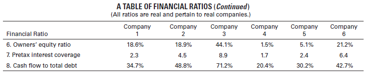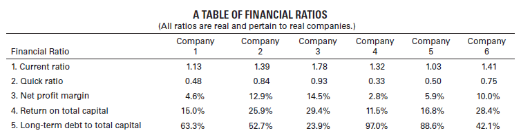 A TABLE OF FINANCIAL RATIOS (All ratios are real and pertain to real companies.) Company Company Company Company Company Company Financial Ratio 1 2 3 4 5 6 1. Current ratio 1.13 1.39 1.78 1.32 1.03 1.41 2. Quick ratio 0.48 0.84 0.93 0.33 0.50 0.75 3. Net profit margin 4.6% 12.9% 14.5% 2.8% 5.9% 10.0% 4. Return on total capital 15.0% 25.9% 29.4% 11.5% 16.8% 28.4% 5. Long-term debt to total capital 63.3% 52.7% 23.9% 97.0% 88.6% 42.1% A TABLE OF FINANCIAL RATIOS (Continued) (All ratios are real and pertain to real companies.) Company Company Company Company Company Company Financial Ratio 1 2 3 4 6 6. Owners' equity ratio 18.6% 18.9% 44.1% 1.5% 5.1% 21.2% 7. Pretax interest coverage 2.3 4.5 8.9 1.7 2.4 6.4 8. Cash flow to total debt 34.7% 48.8% 71.2% 20.4% 30.2% 42.7%
