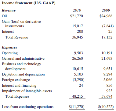 Income Statement (US. GAAP) Revenue 2010 2009 Oil $21,720 $24,968 Gain (loss) on derivative instruments 15,017 (7,841) Interest 208 25 Total Revenue 36,945 17,152 Expenses Operating 9,503 10,191 General and administrative 26,260 21,693 Business and technology development Depletion and depreciation Foreign exchange 10,615 9,651 5,103 9,294 (3,290) 5,066 Interest and financing Impairment of intangible assets Total Expenses 24 856 923 48,215 57,674 Loss from continuing operations $(11,270) $(40,522)