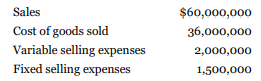 Sales $60,000,000 Cost of goods sold Variable selling expenses 36,000,000 2,000,000 Fixed selling expenses 1,500,000