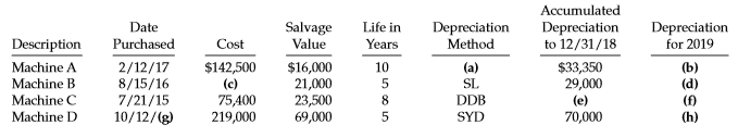 Accumulated Date Salvage Value Depreciation Life in Depreciation Method Depreciation to 12/31/18 Description Purchased Cost Years for 2019 Machine A 2/12/17 8/15/16 7/21/15 $142,500 (c) 75,400 219,000 $16,000 21,000 23,500 69,000 10 (a) IS DDB $33,350 29,000 (b) (d) Machine B Machine C Machine D 8 (e) 10/12/(g) SYD 70,000 (h)