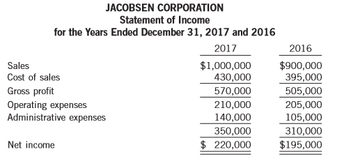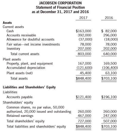 JACOBSEN CORPORATION Statement of Financial Position as at December 31, 2017 and 2016 2017 2016 Assets Current assets $163,000 392,000 (37,000) $ 82,000 296,000 (18,000) Cash Accounts receivable Allowance for doubtful accounts 78,000 207,000 803,000 Fair value-net income investments 78,000 202,000 640,000 Inventory Total current assets Plant assets Property, plant, and equipment Accumulated depreciation 167,000 (121,600) 45,400 $848,400 169,500 (106,400) 63,100 Plant assets (net) Total assets $703,100 Liabilities and Shareholders' Equity Liabilities Accounts payable $121,400 $196,100 Shareholders' equity Common shares, no par value, 50,000 authorized, 20,000 issued and outstanding Retained earnings 260,000 467,000 727,000 260,000 247,000 507,000 Total shareholders' equity Total liabilities and shareholders' equity $848,400 $703,100 JACOBSEN CORPORATION Statement of Income for the Years Ended December 31, 2017 and 2016 2017 2016 $1,000,000 430,000 570,000 $900,000 395,000 Sales Cost of sales Gross profit Operating expenses Administrative expenses 505,000 210,000 205,000 105,000 140,000 350,000 310,000 $195,000 Net income $ 220,000