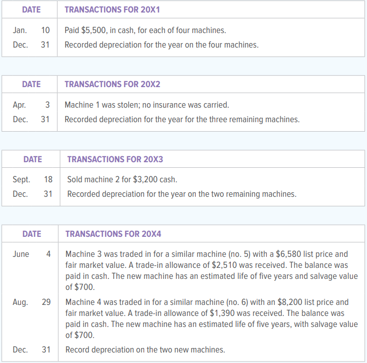 James Company purchased four identical machines on January 10, 20X1, paying $5,500 for each. The useful life of each machine is expected to be five years, with a salvage value of $700 each. The company uses the straight-line method of depreciation. Selected transactions involving the machines follow. The accounts for recording these transactions are also given.