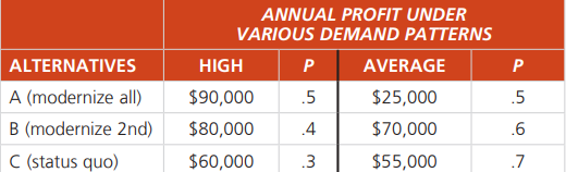 James Lawsonâs Bed and Breakfast, in a small historic Mississippi town, must decide how to subdivide (remodel) the large old home that will become its inn. There are three alternatives: Option A would modernize all baths and combine rooms, leaving the inn with four suites, each suitable for two to four adults. Option B would modernize only the second floor; the results would be six suites, four for two to four adults, two for two adults only. Option C (the status quo option) leaves all walls intact. In this case, there are eight rooms available, but only two are suitable for four adults, and four rooms will not have private baths. The details of profit and demand patterns that will accompany each option are: