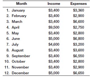 Jason Wright is a part-time business student who would like to optimize his financial decisions. Currently, he has $16,000 in his savings account. Based on an analysis of his take-home pay, expected bonuses, and anticipated tax refund, he has estimated his income for each month over the next year. In addition, he has estimated his monthly expenses, which vary because of scheduled payments for insurance, utilities, tuition and books, and so on. The following table summarizes his estimates: