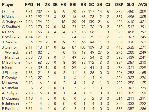 Jeff Sagarin has been providing sports ratings for USA Today since 1985. In baseball his predicted RPG (runs per game) statistic takes into account the entire playerâs offensive statistics, and is claimed to be the best measure of a playerâs true offensive value. The following data show the RPG and a variety of offensive statistics for a Major League Baseball (MLB) season for 20 members of the New York Yankees. The labels on columns are defined as follows: RPG, predicted runs per game statistic; H, hits; 2B, doubles; 3B, triples; HR, home runs; RBI, runs batted in; BB, bases on balls (walks); SO, strikeouts; SB, stolen bases; CS, caught stealing; OBP, on-base percentage; SLG, slugging percentage; and AVG, batting average.