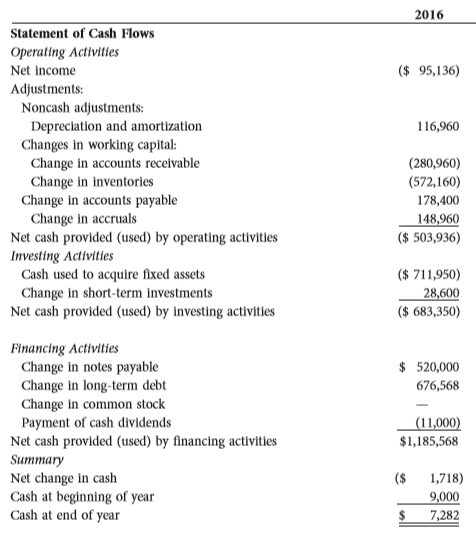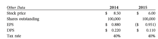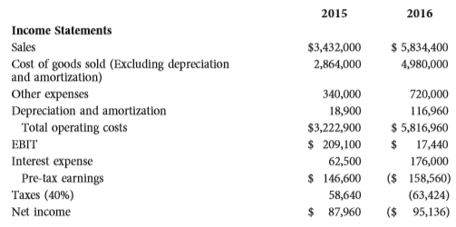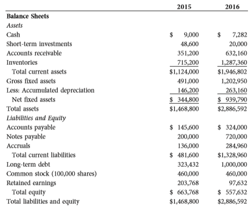 2015 2016 Balance Sheets Assets Cash $ 9,000 $ 7,282 Short-term investments 48,600 20,000 Accounts receivable 351,200 632,160 Inventories 715,200 $1,124,000 1,287,360 Total current assets $1,946,802 Gross fixed assets 491,000 1,202,950 Less: Accumulated depreciation Net fixed assets 146,200 263,160 $ 344,800 $ 939,790 Total assets $1,468,800 $2,886,592 Liabilities and Equity Accounts payable Notes payable $ 145,600 200,000 $ 324,000 720,000 Accruals 136,000 284,960 Total current liabilities $ 481,600 $1,328,960 Long-term debt Common stock (100,000 shares) 323,432 1,000,000 460,000 460,000 Retained earnings Total equity Total liabilities and equity 203,768 97,632 $ 663,768 $ 557,632 $1,468,800 $2,886,592 2015 2016 Income Statements Sales $3,432,000 $ 5,834,400 Cost of goods sold (Excluding depreciation and amortization) 2,864,000 4,980,000 Other expenses depreciation and amortization Total operating costs 340,000 720,000 18,900 116,960 $3,222,900 $ 5,816,960 EBIT $ 209,100 $ 17,440 Interest expense Pre-tax earnings Тахes (40%) 62,500 176,000 $ 146,600 ($ 158,560) (63,424) ($ 95,136) 58,640 Net income $ 87,960 Other Data Stock price Shares outstanding 2014 2015 $ 8.50 6.00 100,000 100,000 $ 0.880 $ 0.220 EPS ($ 0.951) DPS $ 0.110 Таx rate 40% 40% 2016 Statement of Cash Flows Operating Activities ($ 95,136) Net income Adjustments: Noncash adjustments: depreciation and amortization Changes in working capital: Change in accounts receivable Change in inventories Change in accounts payable Change in accruals Net cash provided (used) by operating activities Investing Activities Cash used to acquire fixed assets Change in short-term investments Net cash provided (used) by investing activities 116,960 (280,960) (572,160) 178,400 148,960 ($ 503,936) ($ 711,950) 28,600 ($ 683,350) Financing Activities Change in notes payable Change in long-term debt Change in common stock $ 520,000 676,568 Payment of cash dividends (11,000) Net cash provided (used) by financing activities $1,185,568 Summary Net change in cash Cash at beginning of year Cash at end of year (4 1,718) 9,000 7,282