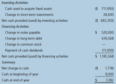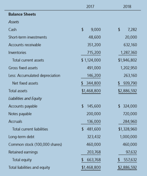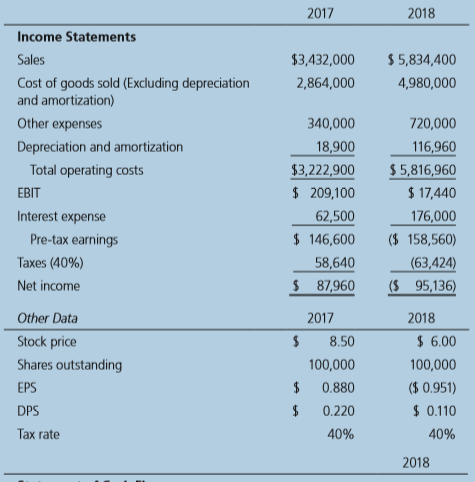 2017 2018 Balance Sheets Assets Cash 2$ 9,000 $ 7,282 Short-term investments 48,600 20,000 Accounts receivable 351,200 632,160 Inventories 715,200 1,287,360 Total current assets $ 1,124,000 $1,946,802 Gross fixed assets 491,000 1,202,950 Less: Accumulated depreciation 146,200 263,160 Net fixed assets $ 344,800 $ 939,790 Total assets $1,468,800 $2,886,592 Liabilities and Equity Accounts payable $ 145,600 $ 324,000 Notes payable 200,000 720,000 Accruals 136,000 284,960 Total current liabilities $ 481,600 $1,328,960 Long-term debt 323,432 1,000,000 Common stock (100,000 shares) 460,000 460,000 Retained earnings 203,768 97,632 Total equity $ 663,768 $ 557,632 Total liabilities and equity $1,468,800 $2,886,592 2017 2018 Income Statements Sales $3,432,000 $ 5,834,400 Cost of goods sold (Excluding depreciation and amortization) 2,864,000 4,980,000 Other expenses 340,000 720,000 116,960 $ 5,816,960 $ 17,440 depreciation and amortization 18,900 Total operating costs $3,222,900 EBIT $ 209,100 Interest expense 62,500 176,000 Pre-tax earnings $ 146,600 ($ 158,560) Taxes (40%) 58,640 $ 87,960 (63,424) ($ 95,136) Net income Other Data 2017 2018 Stock price 8.50 $ 6.00 Shares outstanding 100,000 100,000 EPS $ 0.880 ($ 0.951) DPS 2$ 0.220 $ 0.110 Тax rate 40% 40% 2018 Statement of Cash Flows Operating Activities Net income ($ 95,136) Adjustments: Noncash adjustments: depreciation and amortization 116,960 Changes in working capital: Change in accounts receivable (280,960) Change in inventories (572,160) Change in accounts payable 178,400 Change in accruals 148,960 Net cash provided (used) by operating activities ($ 503,936) Continued. Investing Activities Cash used to acquire fixed assets ($ 711,950) Change in short-term investments 28,600 Net cash provided (used) by investing activities ($ 683,350) Financing Activities Change in notes payable $ 520,000 Change in long-term debt 676,568 Change in common stock Payment of cash dividends (11,000) Net cash provided (used) by financing activities $ 1,185,568 Summary Net change in cash (2$ 1,718) Cash at beginning of year 9,000 Cash at end of year 7,282