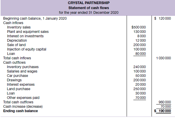 Beginning cash balance, 1 January 2020 Cash inflows Inventory sales Plant and equipment sales Interest on investments Depreciation Sale of land Injection of equity capital Loan Total cash inflows Cash outflows Inventory purchases Salaries and wages Car purchase Drawings Interest expenses Land purchase Loan Other expenses paid CRYSTAL PARTNERSHIP Statement of cash flows for the year ended 31 December 2020 Total cash outflows Cash increase (decrease) Ending cash balance $500 000 130 000 8000 12 000 200 000 100 000 80 000 240 000 100 000 50 000 200 000 20 000 250 000 30 000 70 000 $ 120000 1 030 000 960 000 70 000 190 000