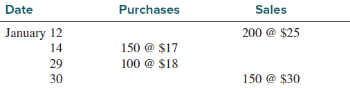 Date Purchases Sales January 12 14 200 @ $25 150 @ $17 100 @ $18 29 30 150 @ $30