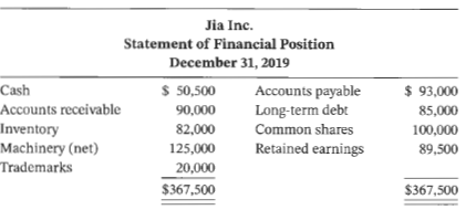 Jia Inc. applies ASPE and had the following statement of financial position at the end of operations for 2019: