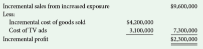 Incremental sales from increased exposure Less: $9,600,000 Incremental cost of goods sold Cost of TV ads $4,200,000 3,100,000 7,300,000 Incremental profit $2,300,000