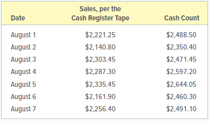 During the first week of August, John noticed an increase in business. However, the cash deposits to the bank were less than John expected. He has contacted you for advice. You have compiled the sales per the cash register tapes, and the cash counts, for the period from August 1 to August 7. These amounts are as follows: