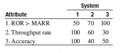 John, who works for Dumas Jewelers, has decided to use the weighted attribute method to compare three systems of cutting diamonds for setting into rings, earrings, necklaces, and bracelets. Once the final inspector and cutting manager scored each of three attributes in terms of importance to them, John placed an evaluation from 0 to 100 on each system for the three attributes. Johnâs ratings for each system follow:
