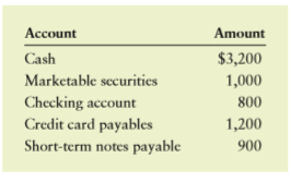 Account Amount Cash $3,200 Marketable securities 1,000 Checking account Credit card payables 800 1,200 Short-term notes payable 900