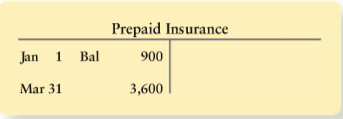 Prepaid Insurance Jan 1 Bal 900 Mar 31 3,600