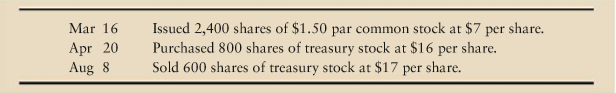 Issued 2,400 shares of $1.50 par common stock at $7 per share. Purchased 800 shares of treasury stock at $16 per share. Sold 600 shares of treasury stock at $17 per share. Mar 16 Apr 20 Aug 8