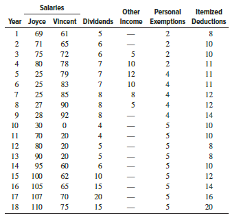 The two have summarized the basic information from their tax returns for the 18 years. They wonder what percentage of their gross income has gone to federal taxes over the years. Apply the tax rate in the latest IRS Publication 17 (www.irs.gov) for married, filing jointly to calculate their taxes each year using a spreadsheet and plot the percentage of GI.