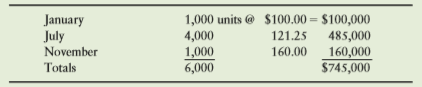 January July November 1,000 units @ $100.00 = $100,000 121.25 %3D 4,000 485,000 160.00 1,000 6,000 160,000 $745,000 Totals