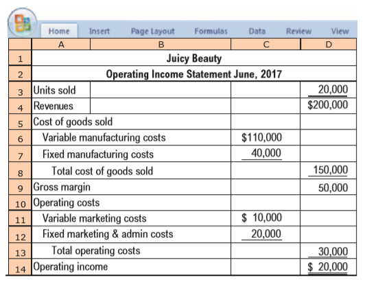 Home Insert Page Layout Formulas Data Review View A D Juicy Beauty Operating Income Statement June, 2017 1 3 Units sold 4 Revenues 5 Cost of goods sold Variable manufacturing costs 20,000 $200,000 $110,000 Fixed manufacturing costs 40,000 Total cost of goods sold 9 Gross margin 10 Operating costs Variable marketing costs Fixed marketing & admin costs Total operating costs 8. 150,000 50,000 11 $ 10,000 20,000 12 30,000 $ 20,000 13 14 Operating income