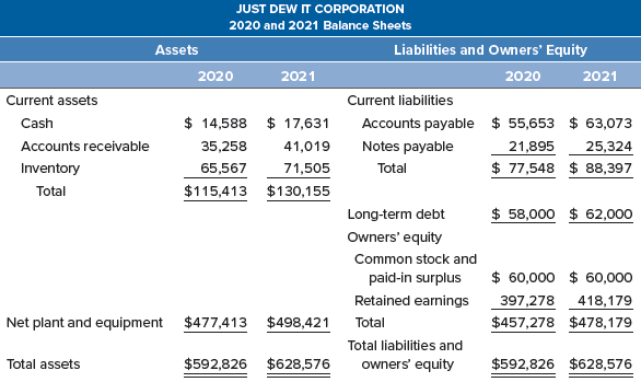 Just Dew It Corporation reports the following balance sheet information for 2020 and 2021. Use this information to work.