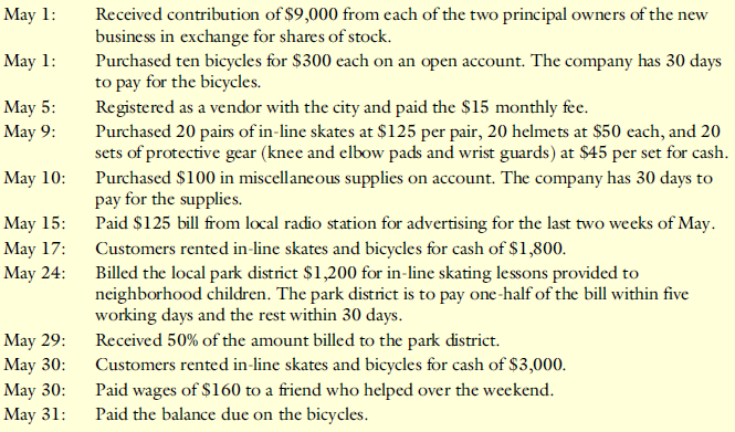 Just Rolling Along Inc. was organized on May 1 by two college students who recognized an opportunity to make money while spending their days at a beach along Lake Michigan. The two entrepreneurs plan to rent bicycles and in-line skates to weekend visitors to the lakefront. The following transactions occurred during the first month of operations: