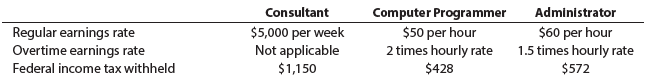 Computer Programmer $50 per hour 2 times hourly rate Consultant Administrator Regular earnings rate Overtime earnings rate $5,000 per week Not applicable $1,150 $60 per hour 1.5 times hourly rate Federal income tax withheld $428 $572