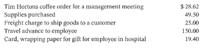 Kali Corp. established a petty cash fund early in 2020 to increase the efficiency of accounting for small cash transactions and to improve control over many of the small expenditures it makes. The company decided to set up the imprest fund at $500 and a cheque was issued for this amount and given to the petty cash custodian. During January, the petty cash custodian made the following disbursements and placed a receipt for each in the cash box provided.