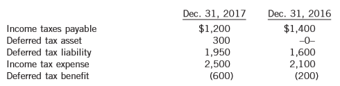 Dec. 31, 2017 Dec. 31, 2016 Income taxes payable Deferred tax asset $1,200 $1,400 300 -0- Deferred tax liability Income tax expense 1,950 2,500 (600) 1,600 2,100 Deferred tax benefit (200)