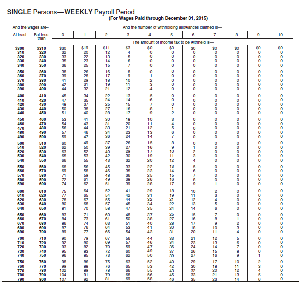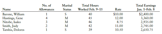 SINGLE Persons-WEEKLY Payroll Period (For Wages Paid through December 31, 2015) And the wages are And the number of withholding allowances clalmed is 10 3 4 5 7 But less than At least The amount of Income tax to be withheld is- $1 $310 320 $300 310 220 320 330 340 340 350 950 360 370 380 370 390 390 390 400 410 420 430 440 400 460 470 480 490 500 510 520 530 540 550 500 510 520 530 540 560 570 500 590 600 550 560 570 580 590 610 620 630 640 650 600 610 620 630 640 650 670 680 690 700 660 670 6A0 690 0000 O 000 00 00 000 O0000 O000 o 00 e00 0000 O 000 00 0000O R000 O 000 00 00 000 00000 00000 0000 O 000 00 00 000 0 0001 R0000 O000 O 0000 O 000 0O 000 00 00 000 g0000 O000 O 0000 O 000 00 000 00 00 001 器寸567 0n=e但博怕怕 但品 8888 8888岛导等导导 导品后品富 岛后岛88 8888留 但但任怕怕们但5 S3S53 858高 5需999 9999高 富岛后 品888 58RRR RRRR品 品S83 38858 3358导每导等导与 岛品 岛岛品8高品岛8R 咫足Rト R品岛品 當岛岛品 岛导等 导与导品后 器富器岛 品8留品8 下ド 爬品品留高品岛 88888 88gさ5 Total Earnings Jan. 1–Feb. 8 $2,400.00 3,360.00 2,935.00 2,745.00 2,650.75 No. of Marital Total Hours Name Allowances Status Worked Feb. 9–15 Rate Baronc, William Hastings, Gene Nitobe, Isako Smith, Judy Tarshis, Dolores $10.00 12.00 8.75 S 40 4 M M M 45 46 2. 42 11.00 39 10.50