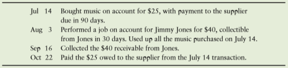 Jul 14 Bought music on account for $25, with payment to the supplier due in 90 days. Aug 3 Performed a job on account for Jimmy Jones for $40, collectible from Jones in 30 days. Used up all the music purchased on July 14. Sep 16 Collected the $40 receivable from Jones. Oct 22 Paid the $25 owed to the supplier from the July 14 transaction.