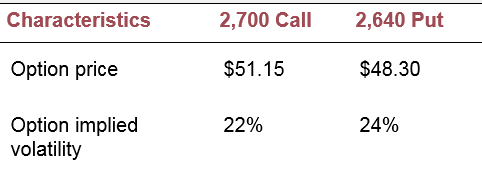 Ken Webster manages a $400 million equity portfolio benchmarked to the S&P 500 Index. Webster believes the market is overvalued when measured by several traditional fundamental/economic indicators. He is therefore concerned about potential losses but recognizes that the S&P 500 Index could nevertheless move above its current 2,649 level. Webster is considering the following option collar strategy: Protection for the portfolio can be attained by purchasing S&P 500 Index puts with a strike price of 2,640. The puts can be approximately financed by selling an equal number of call options with strike price 2,700. Because the combined delta of the purchased put and written call positions (see the following table) is smaller in absolute value than â 1 (that is, â .44 â .30 = â .74), the short options position will not lose more than the underlying stock portfolio will gain if the market advances. The information in the following table describes the two options used to create the collar.