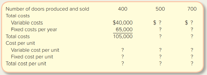 King Peak Company produces one security door model. A partially complete table of its costs follows: